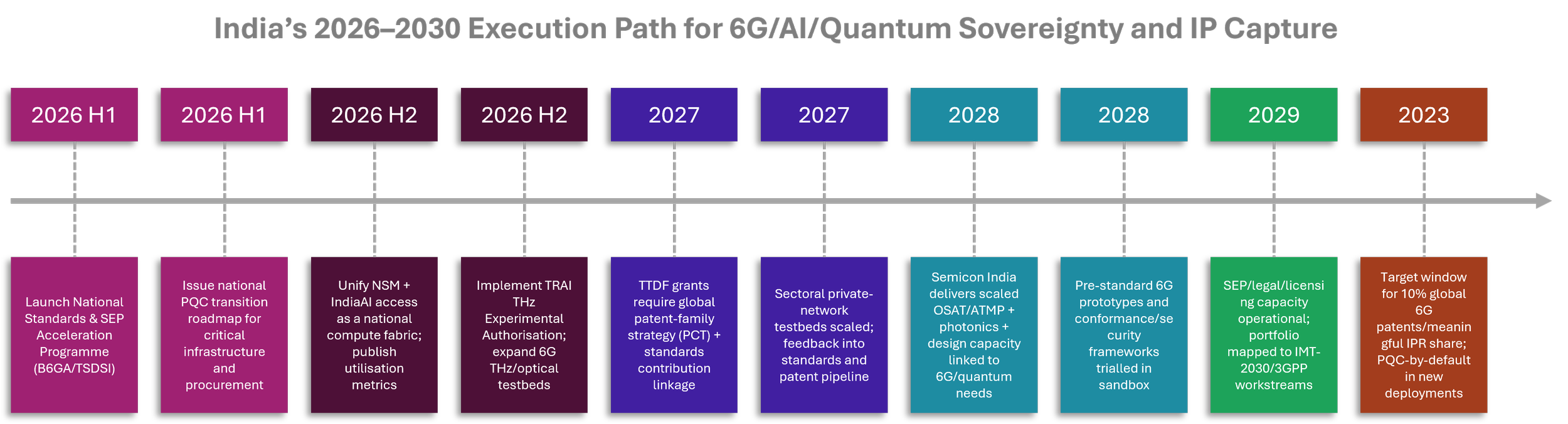 Ultimately, India should establish a National Standards and SEP Acceleration Programme through B6GA and TSDSI. TTDF-funded outputs should be pushed toward global patent families rather than left at the level of domestic filings. NSM and IndiaAI should operate as a single national compute fabric with transparent allocation and utilization metrics. Procurement preferences should be used to create reference buyers for indigenous AI, telecom, and quantum systems. Private-network deployments and industrial testbeds should be expanded so India can generate standards-relevant performance data in real operating environments. Semicon India, meanwhile, should focus on nearer-term wins such as OSAT (Outsourced Semiconductor Assembly and Test), ATMP (Assembly, Test, Mark, and Pack), silicon photonics, and design capacity that directly support 6G and quantum hardware.