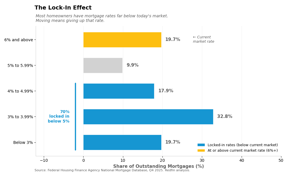 Over half of mortgage holders have rates below 4%, while current market rates exceed 6%. The gap explains why so few are willing to sell.