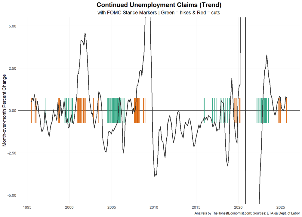 Unlike previous cycles, tightening in 2022–23 did not produce a notable uptick in claims. This suggests that the post-pandemic labor market has become less responsive to interest rate hikes, likely due to structural constraints and demographic changes.